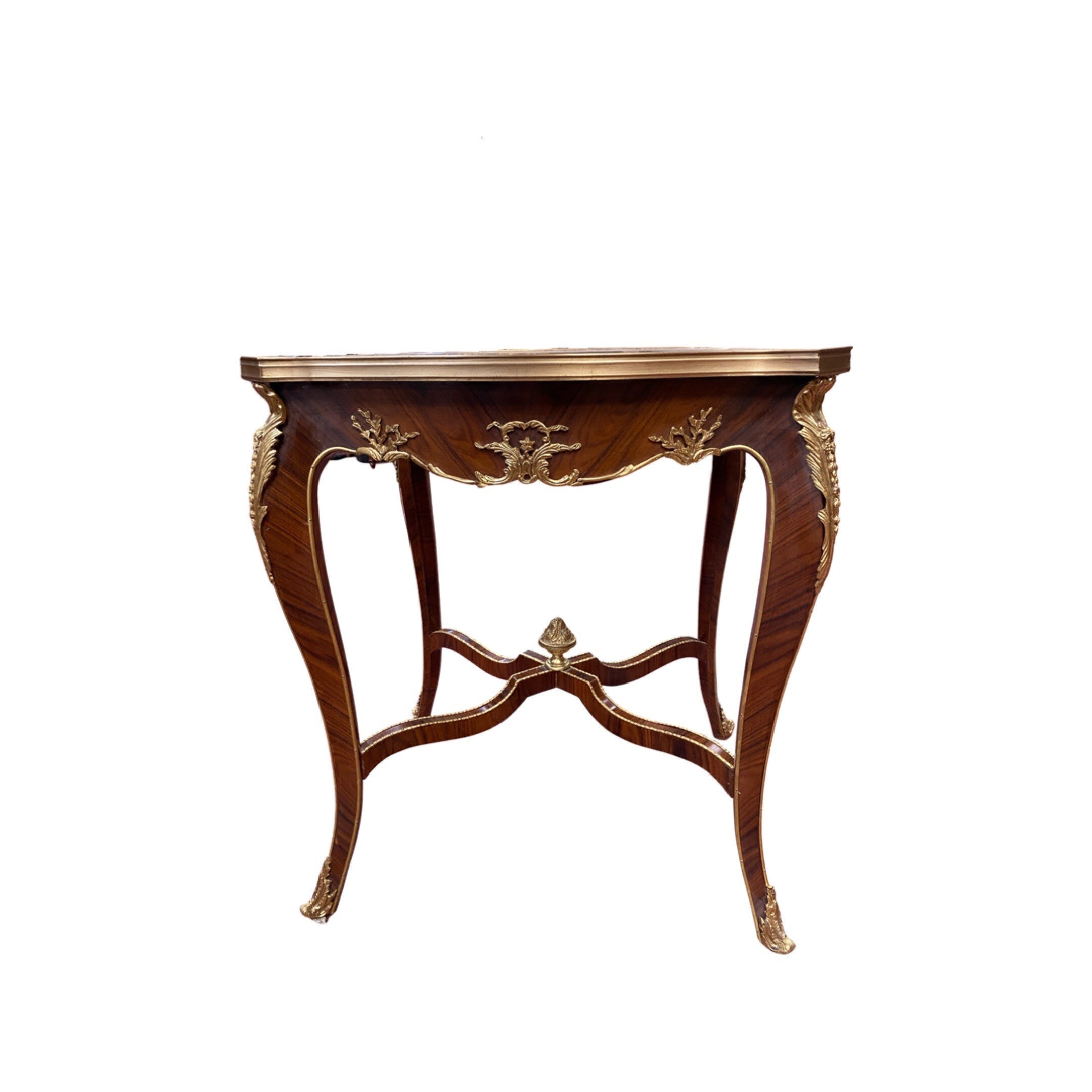 Listed is a period correct Louis XV accent table. Its constructed from solid beech wood, finished in real fruitwood veneer, and features a beautiful recessed marble top and solid brass embellishments.