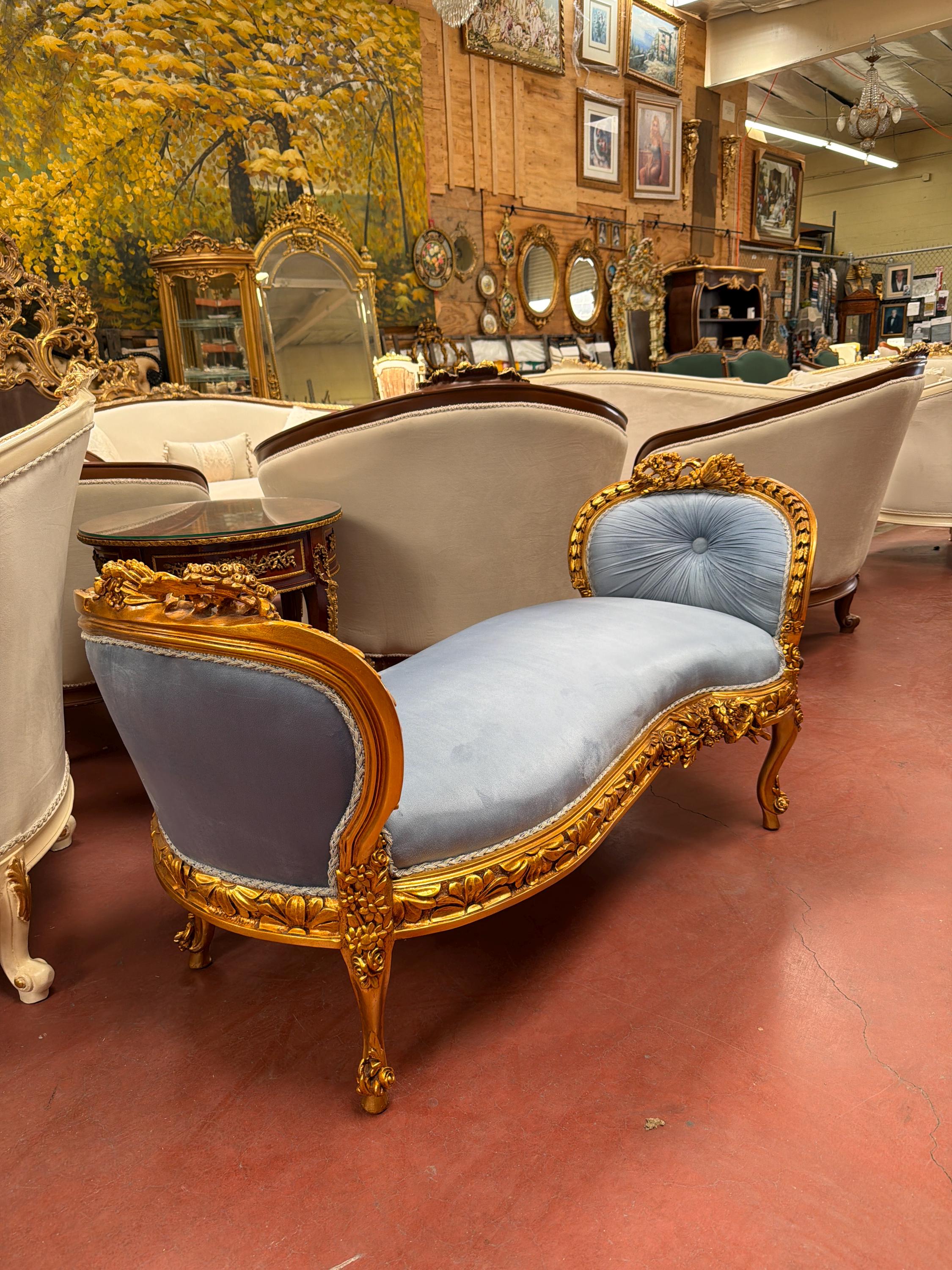 Add a touch of royal elegance to your home with this Louis XVI Style Bench, featuring a stunning hand-carved giltwood frame and luxurious blue velvet upholstery. This elegant French-inspired piece showcases ornate floral and acanthus leaf carvings, finished in radiant gold leaf for an opulent, timeless look.