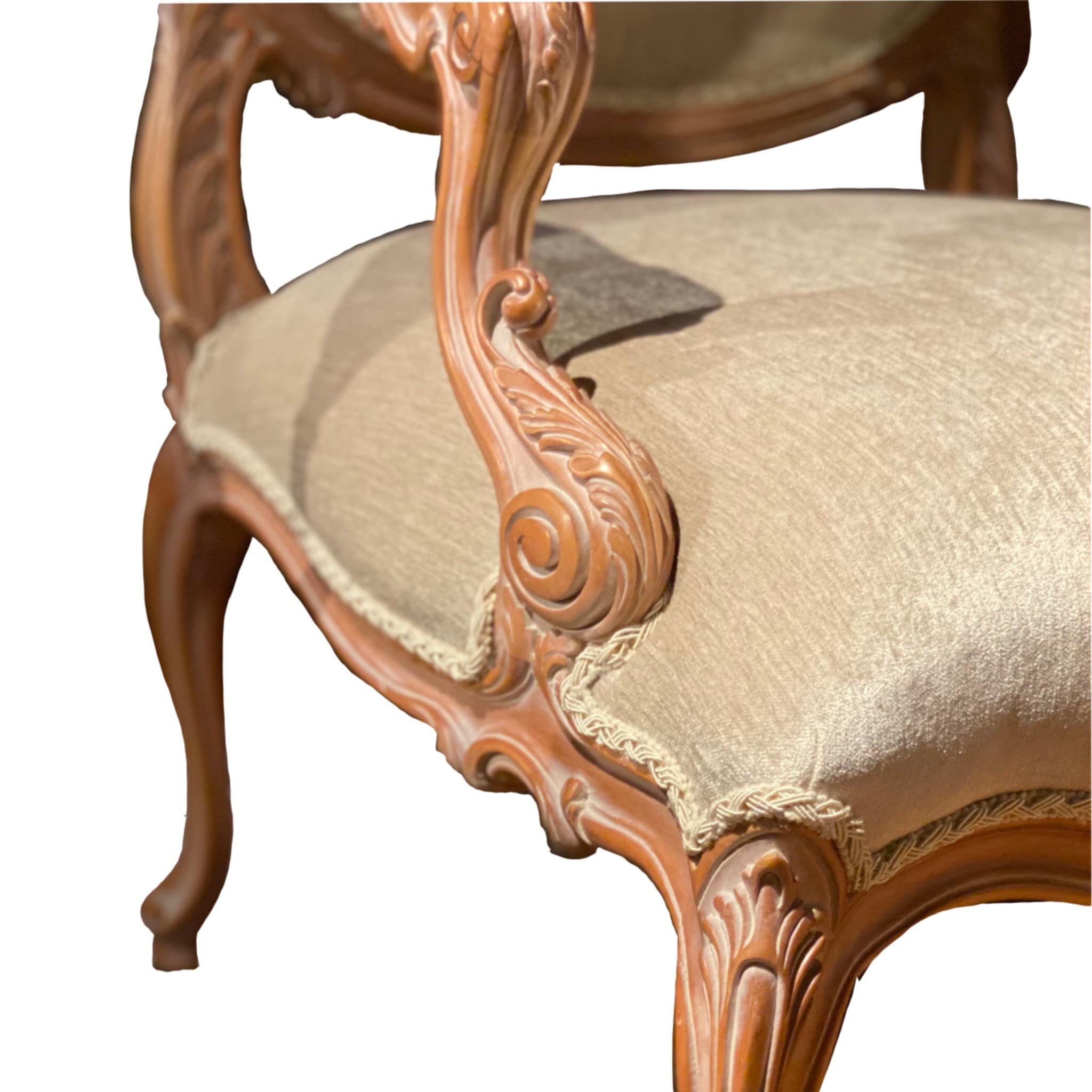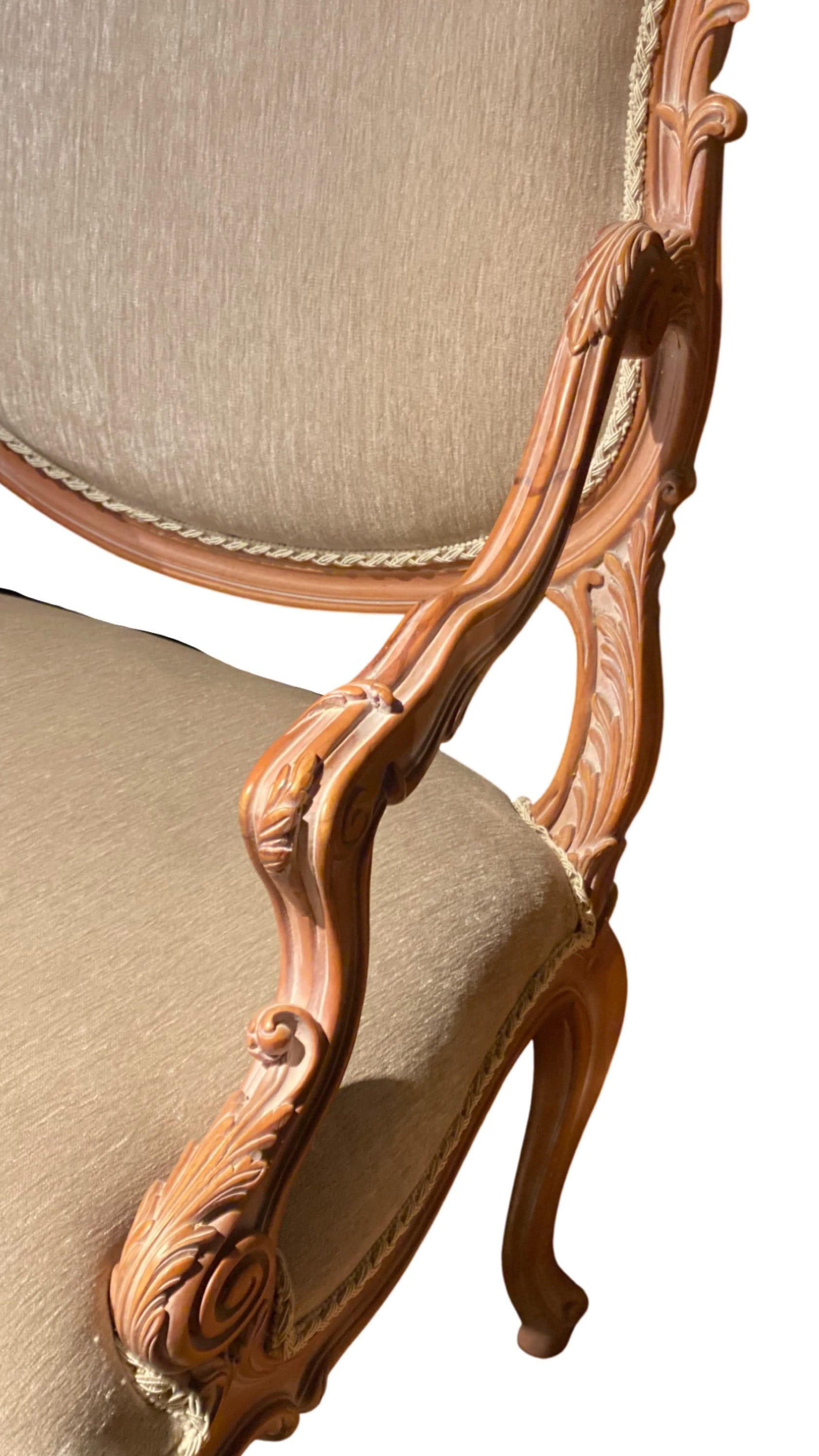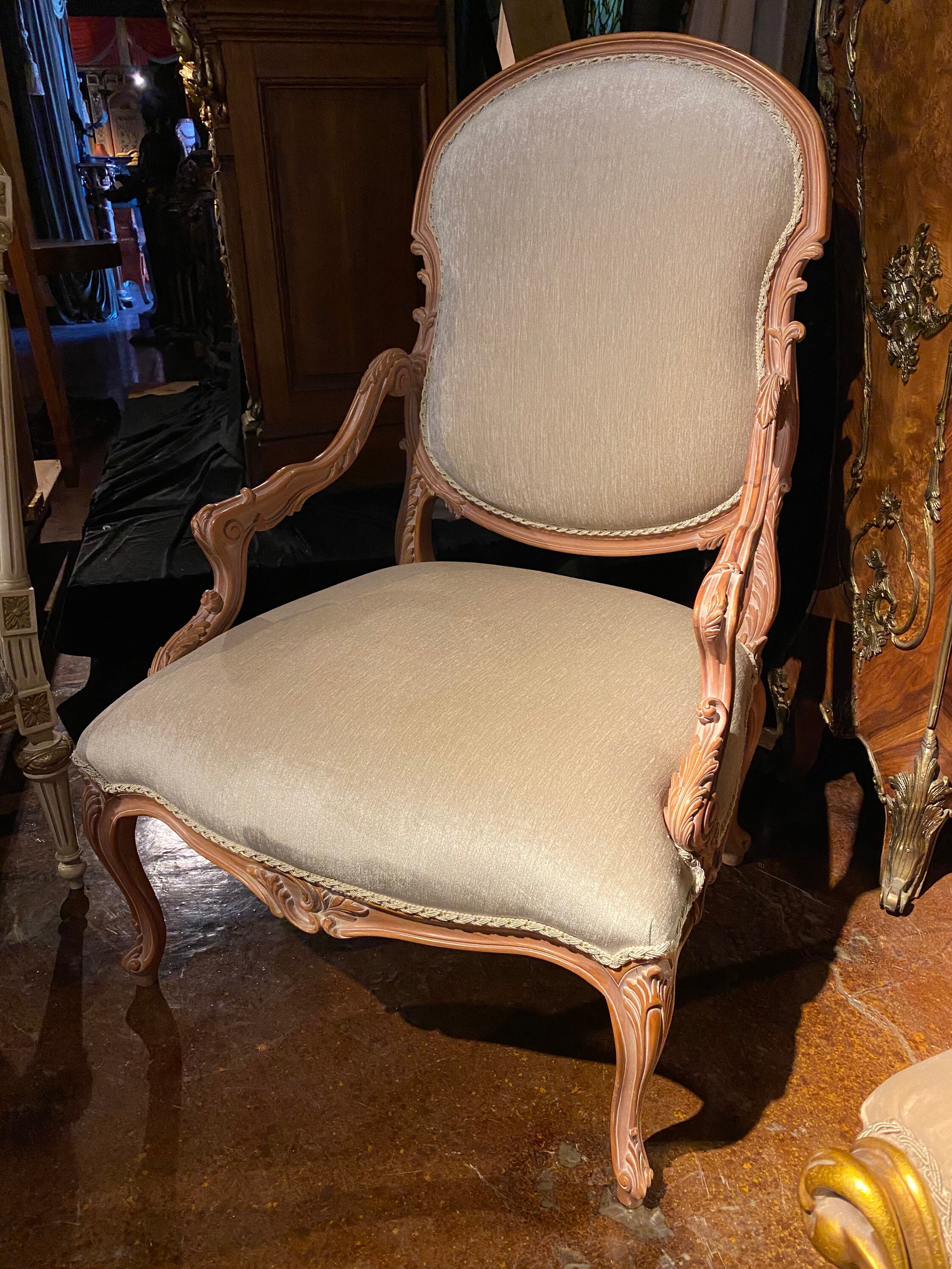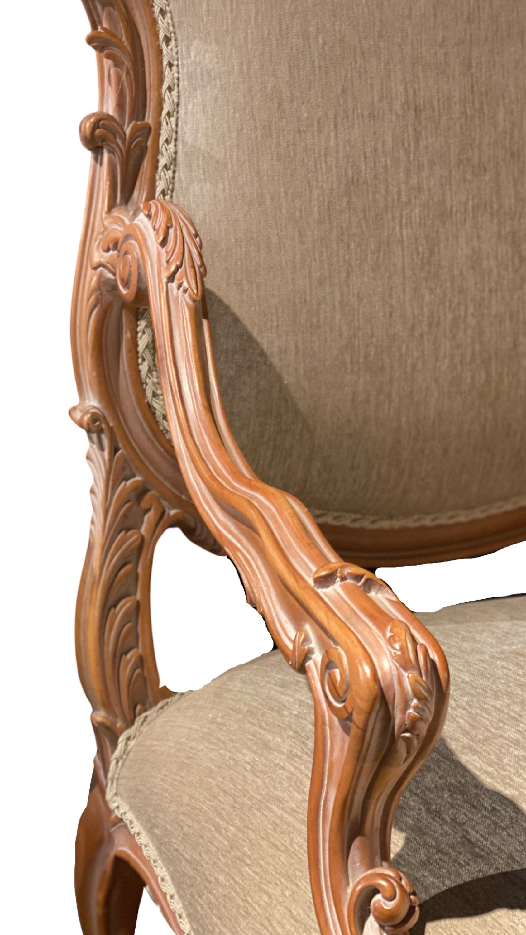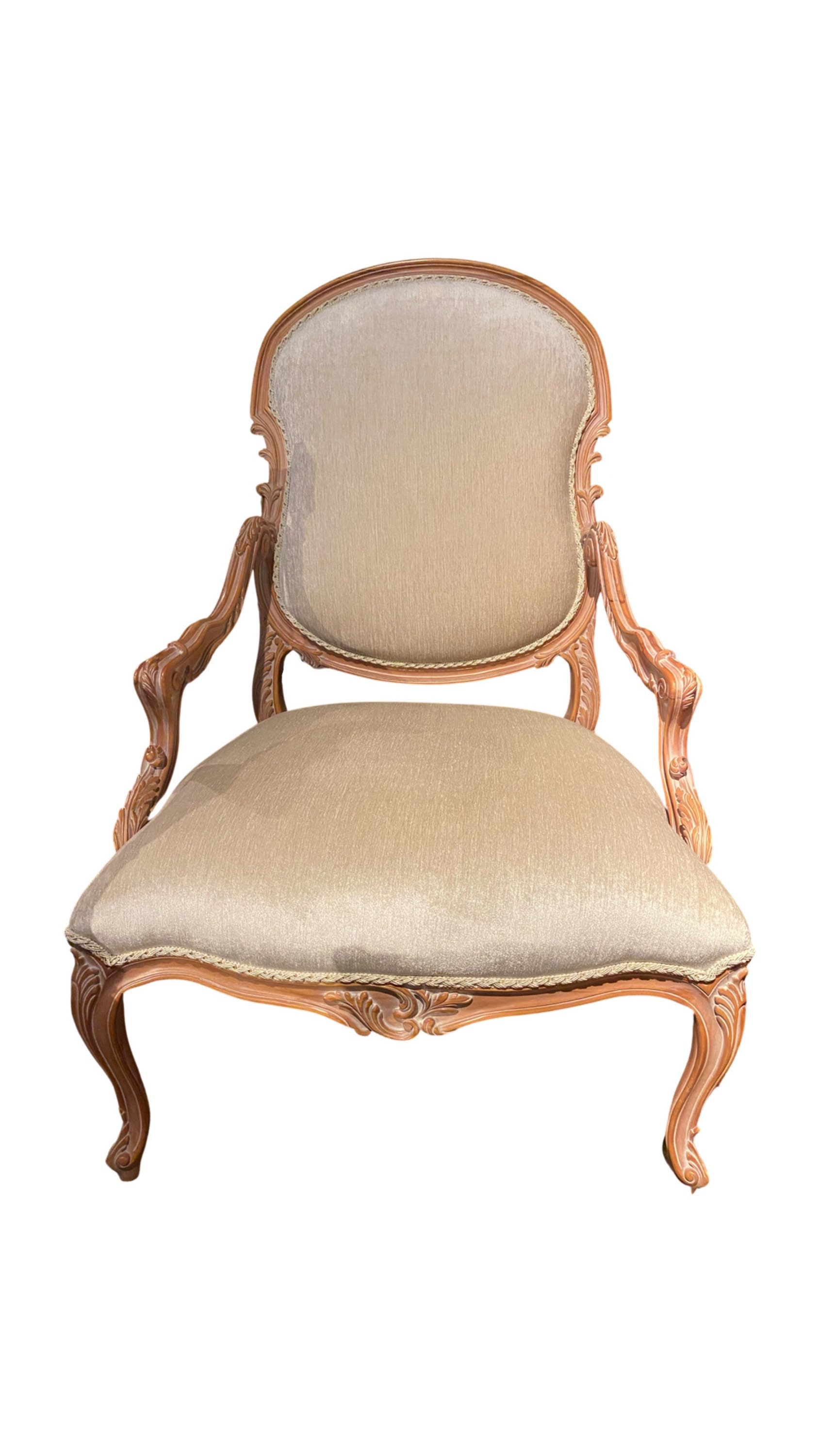 Listed is a beautifully hand carved French provincial armchair. Delicate carvings showcase the natural wood grain; this piece is remarkably unique. It upholstered with an imported chenille fabric