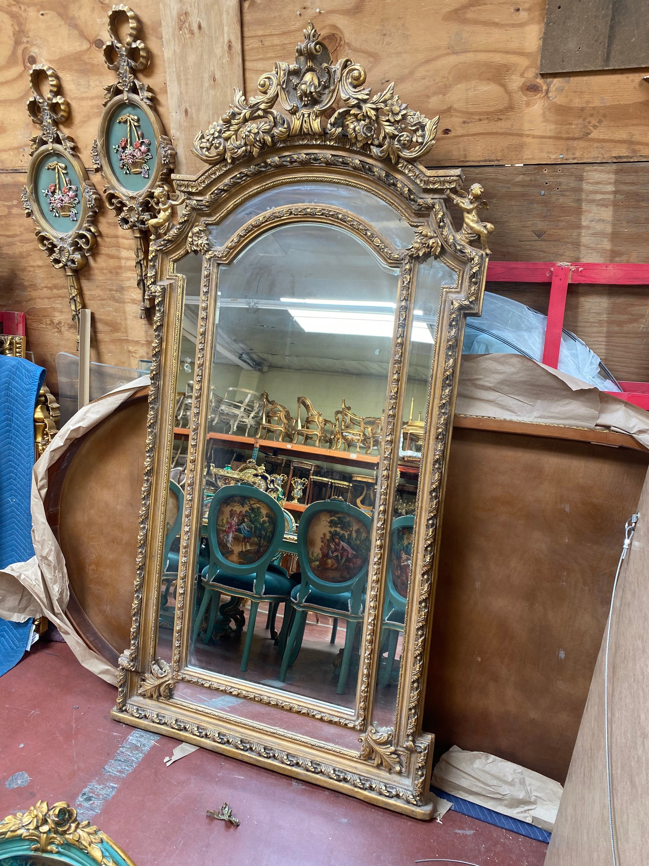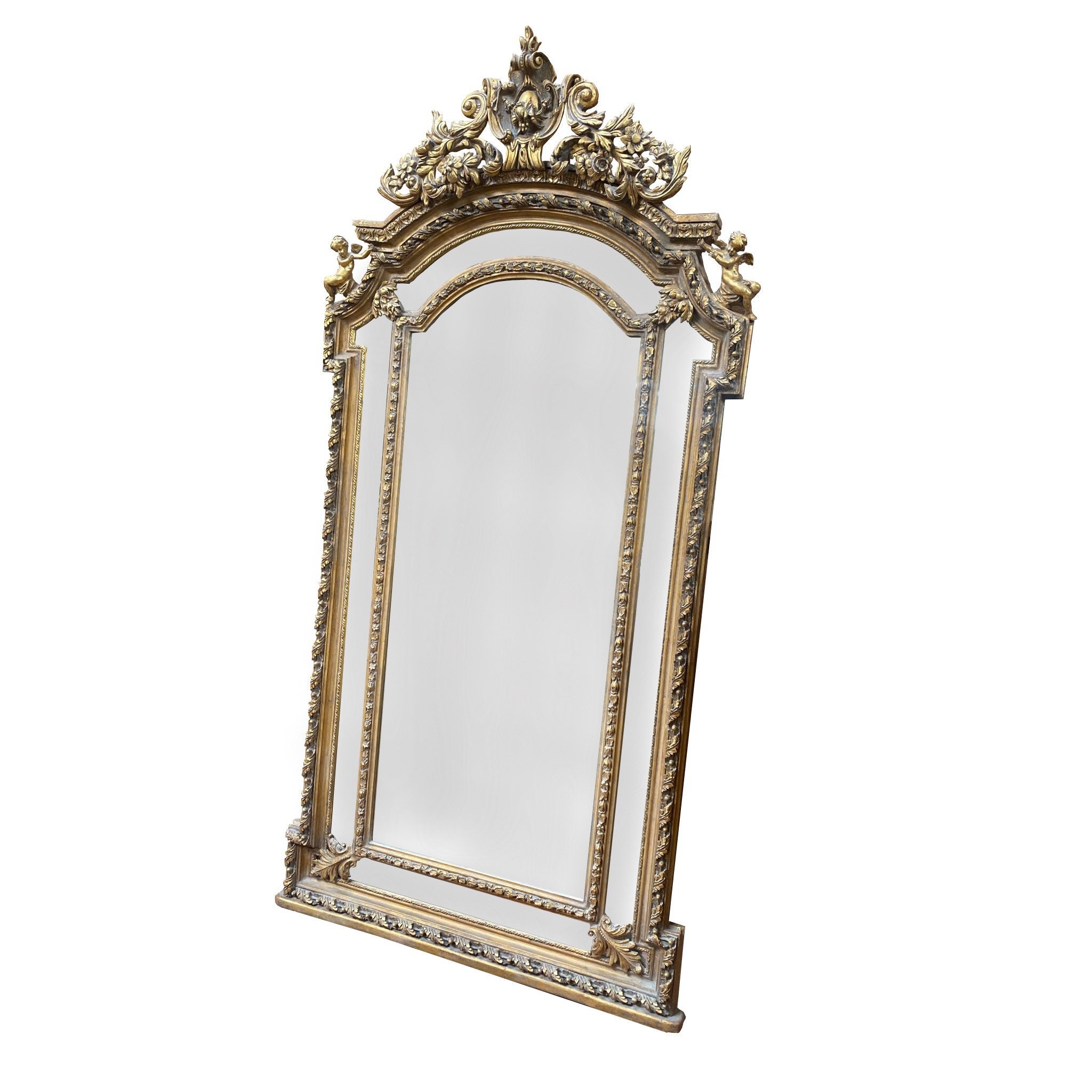 This French style entry mirror is ornately hand carved from solid wood and finished in gold leaf. Standing 8 feet tall it’s truly magnificent in person. It can be used on the floor or hung.