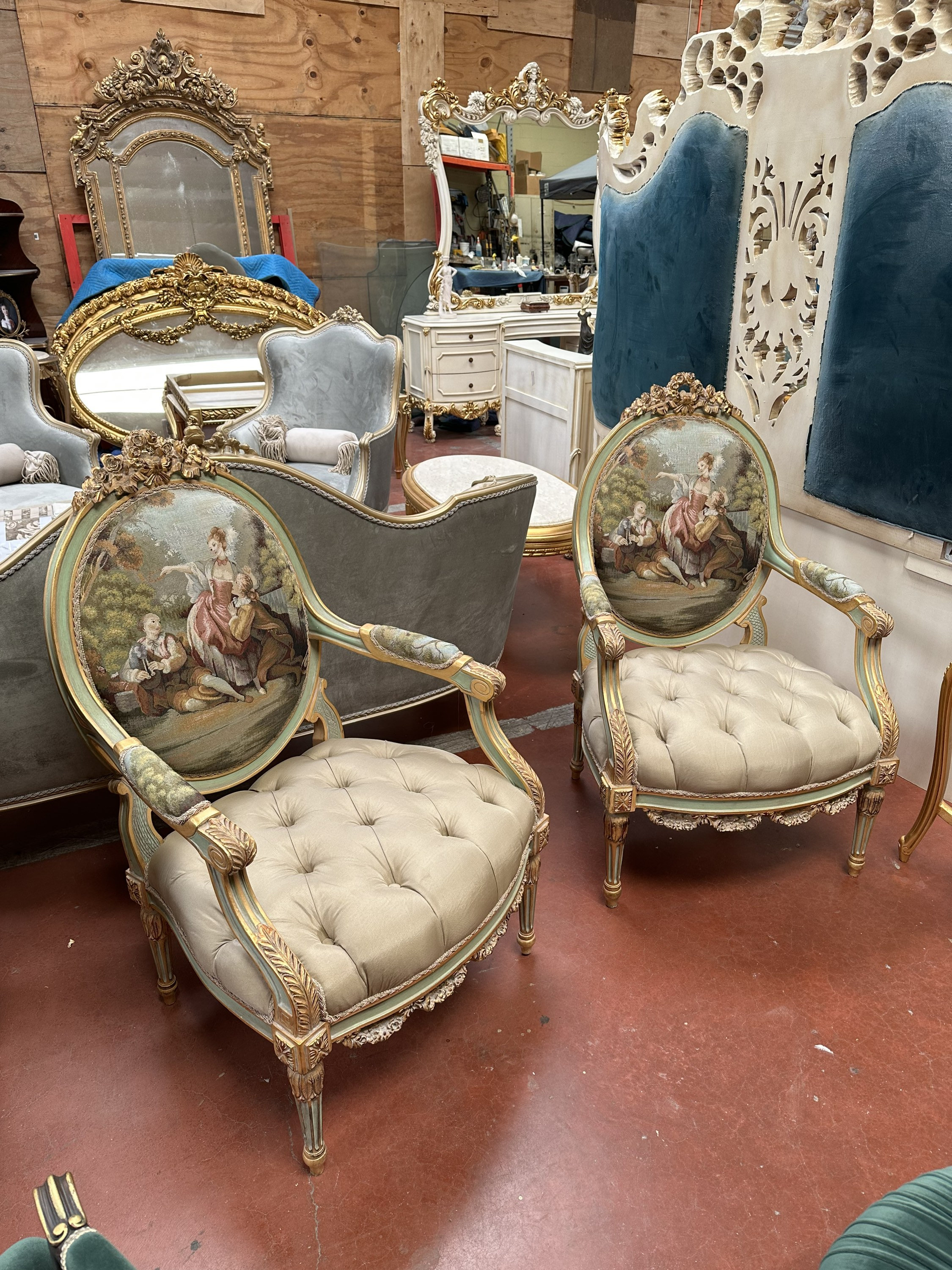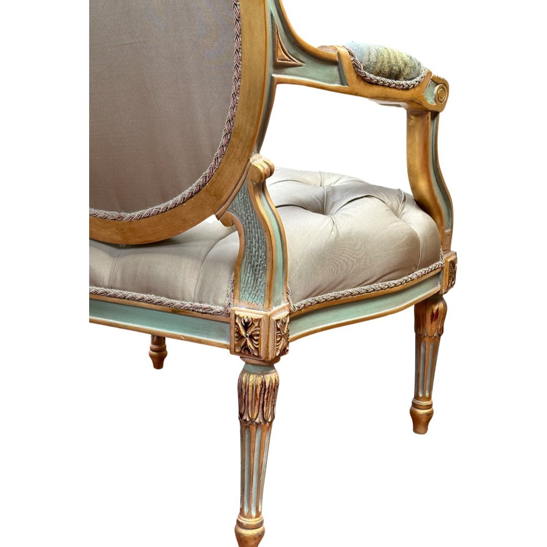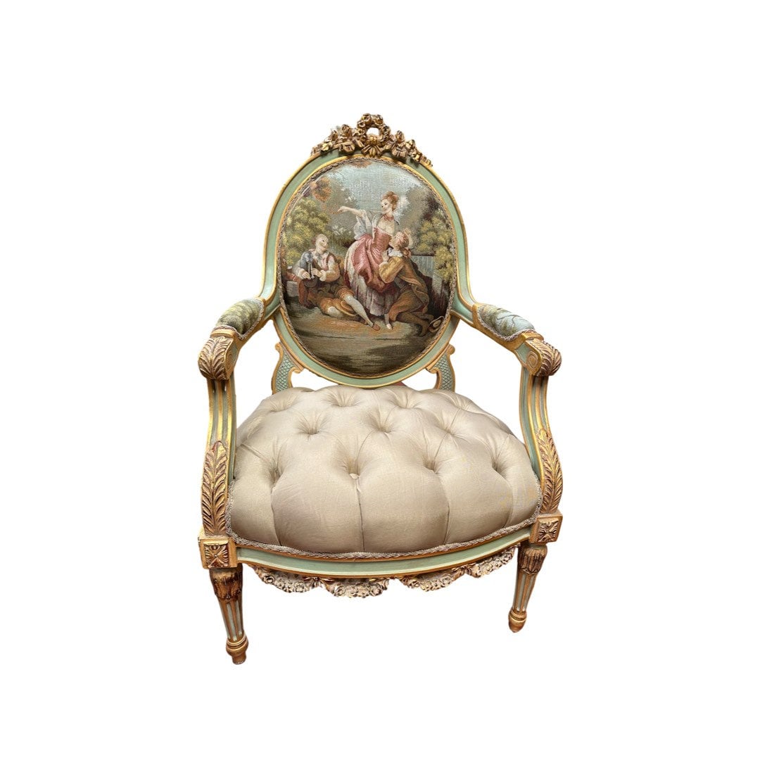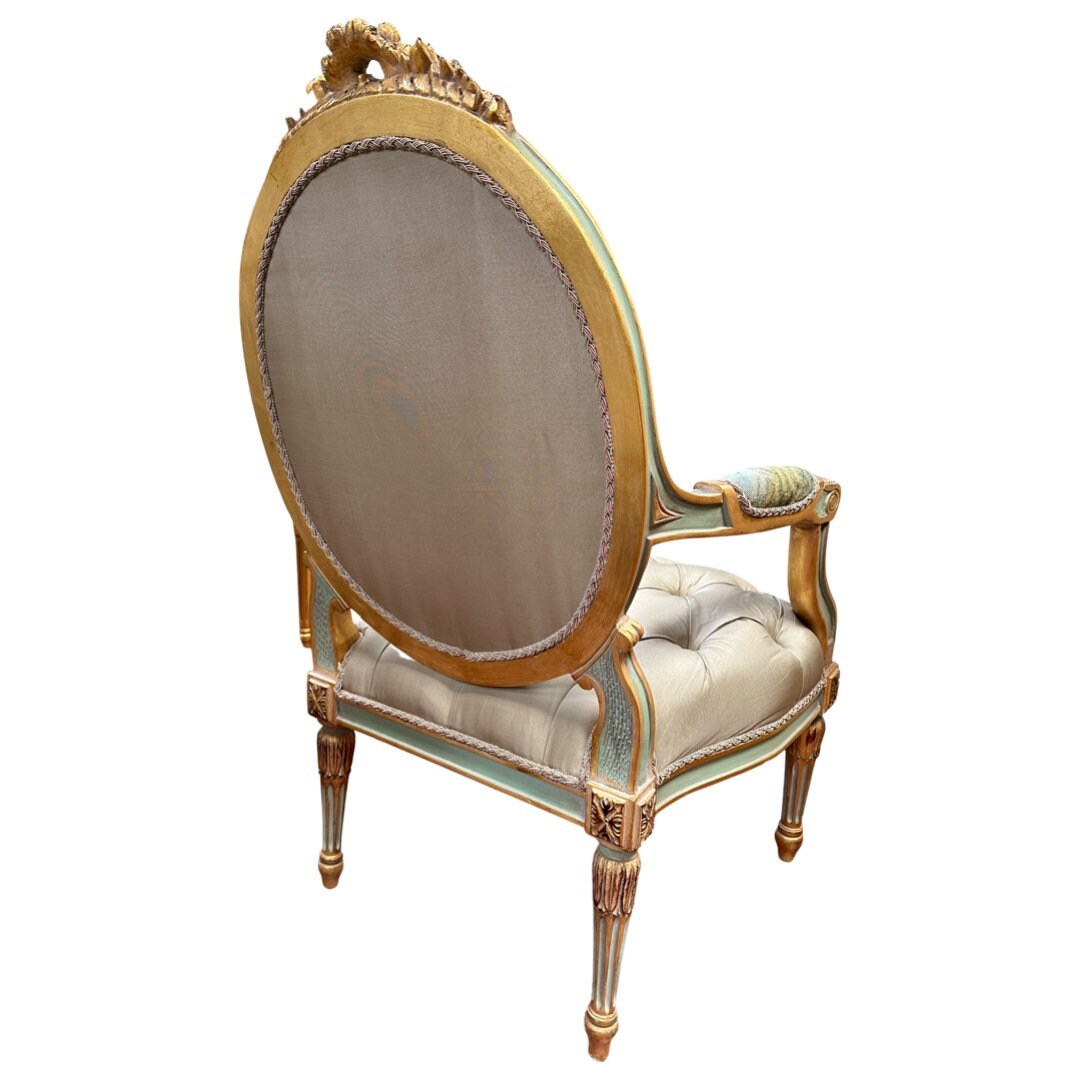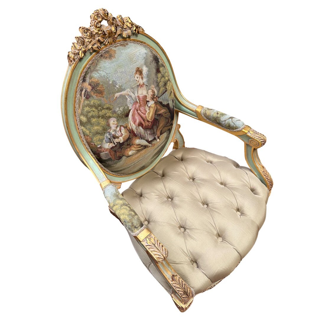 Listed is a gorgeous Louis XVI French style armchair. It’s masterfully crafted from solid beechwood and gilded in gold leaf. It features a tufted seat and embroidered back. Only 2 available.