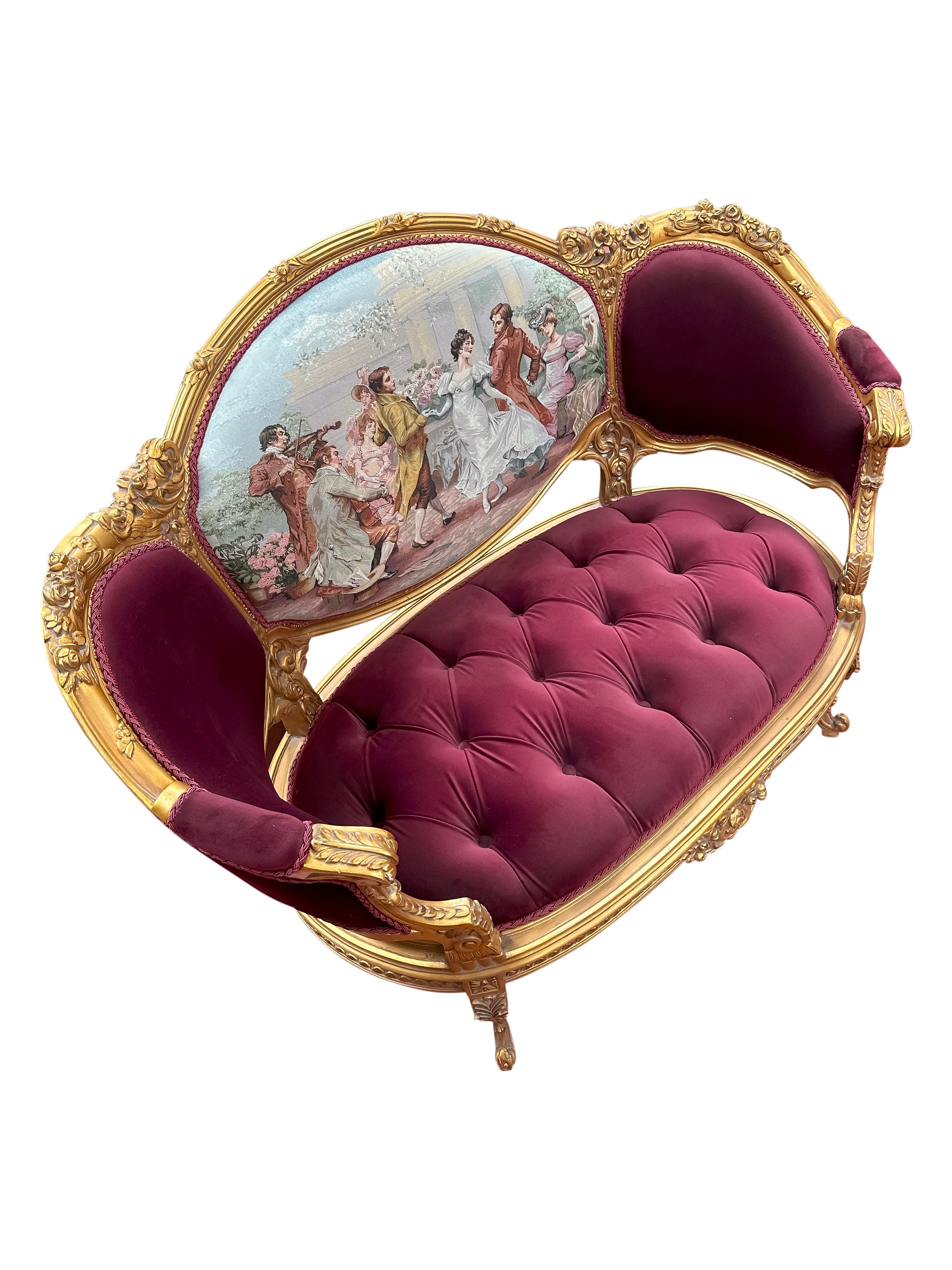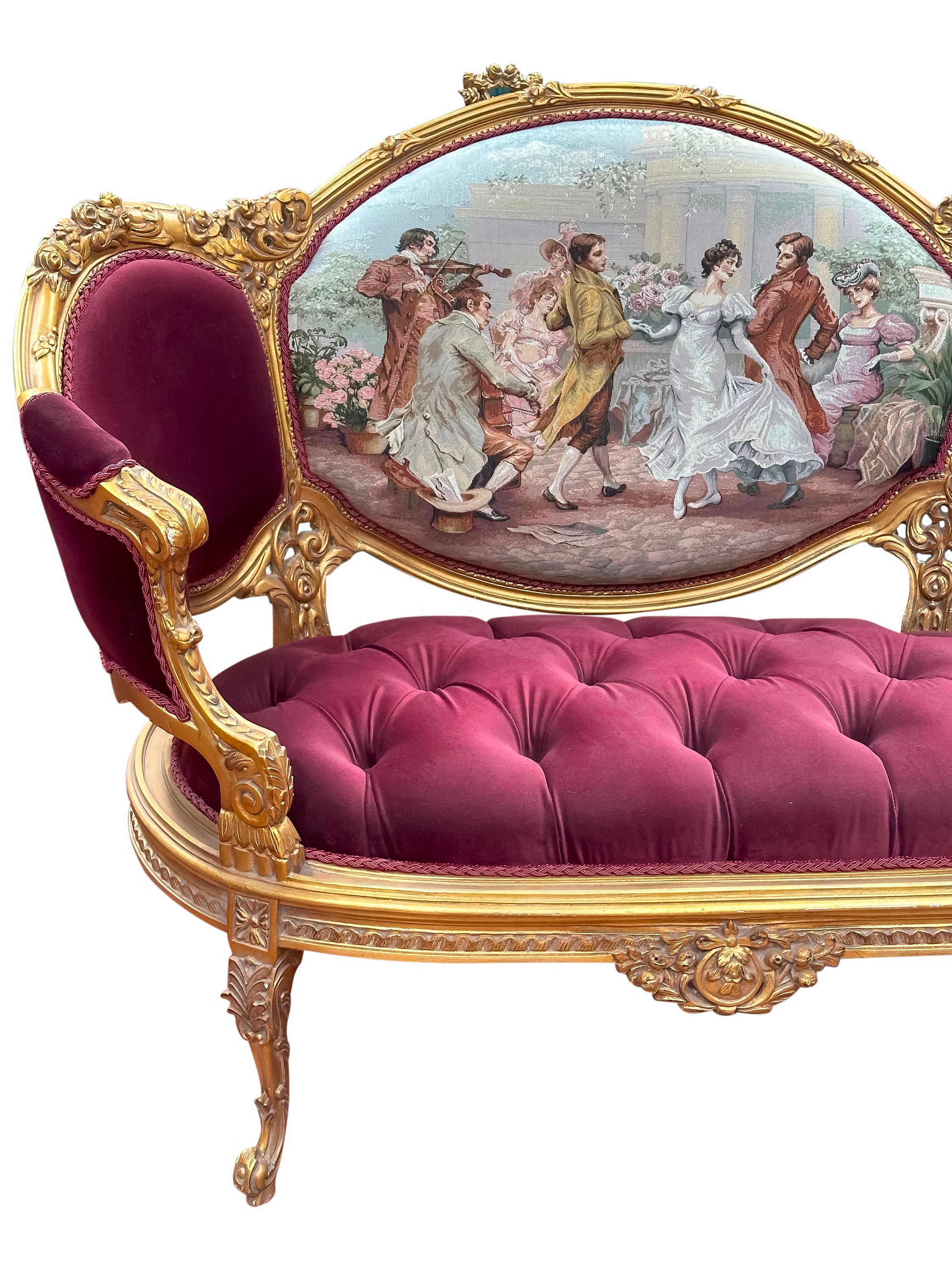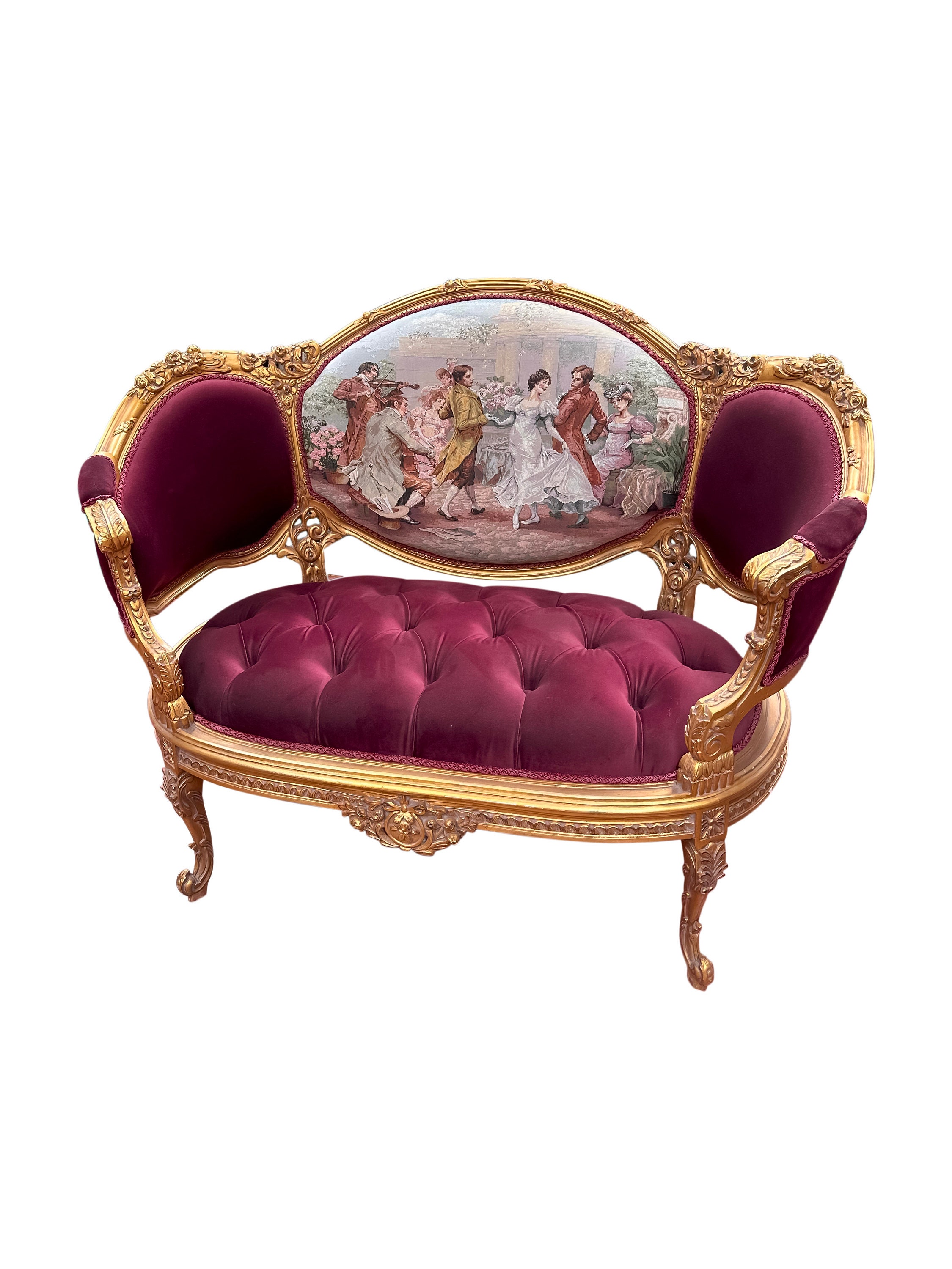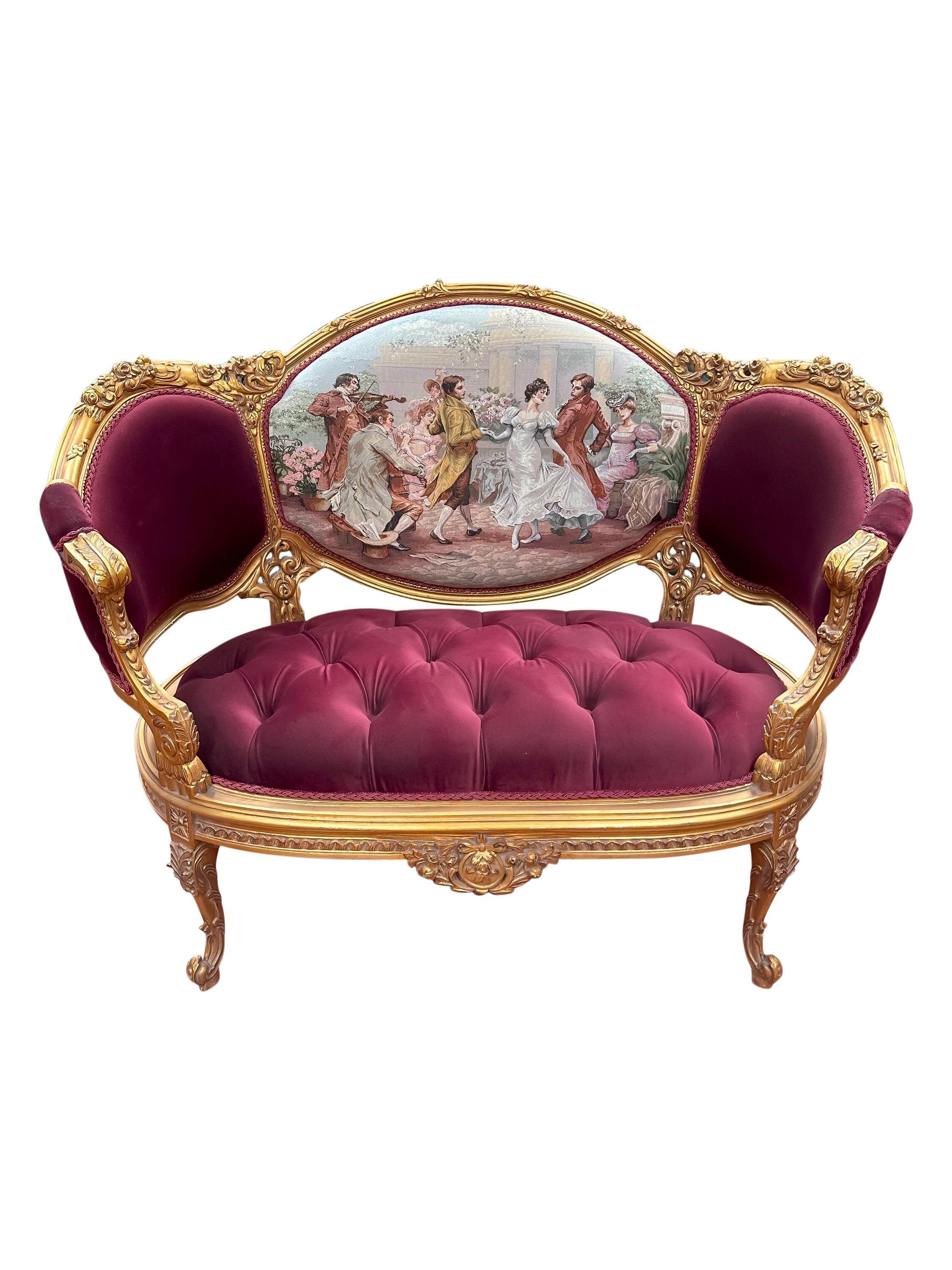 This classic French style settee is hand carved from solid beechwood, finished in gold leaf, and upholstered with a luxurious red velvet with tufted accents. The back of the piece features a beautiful Turkish embroidery.