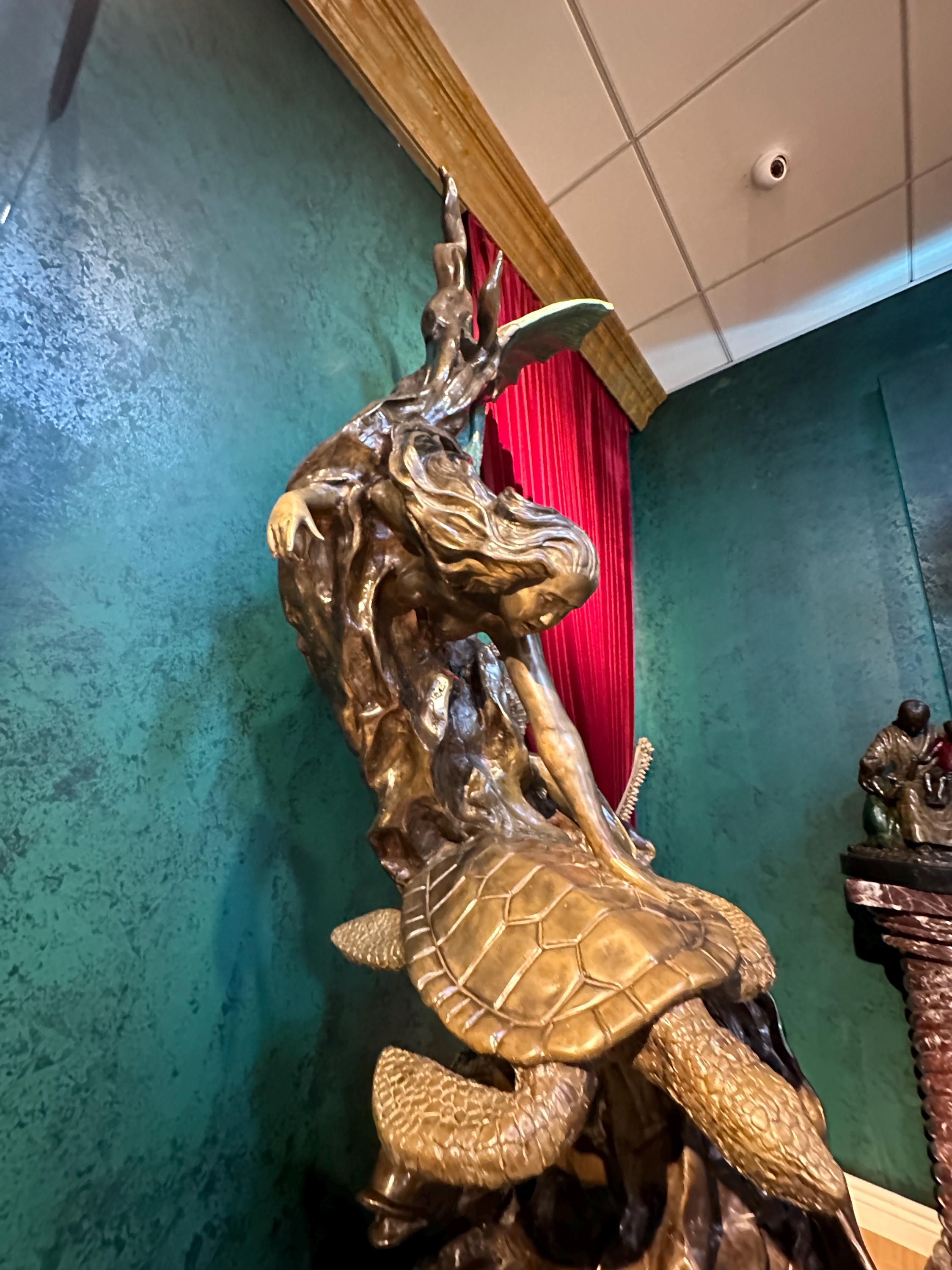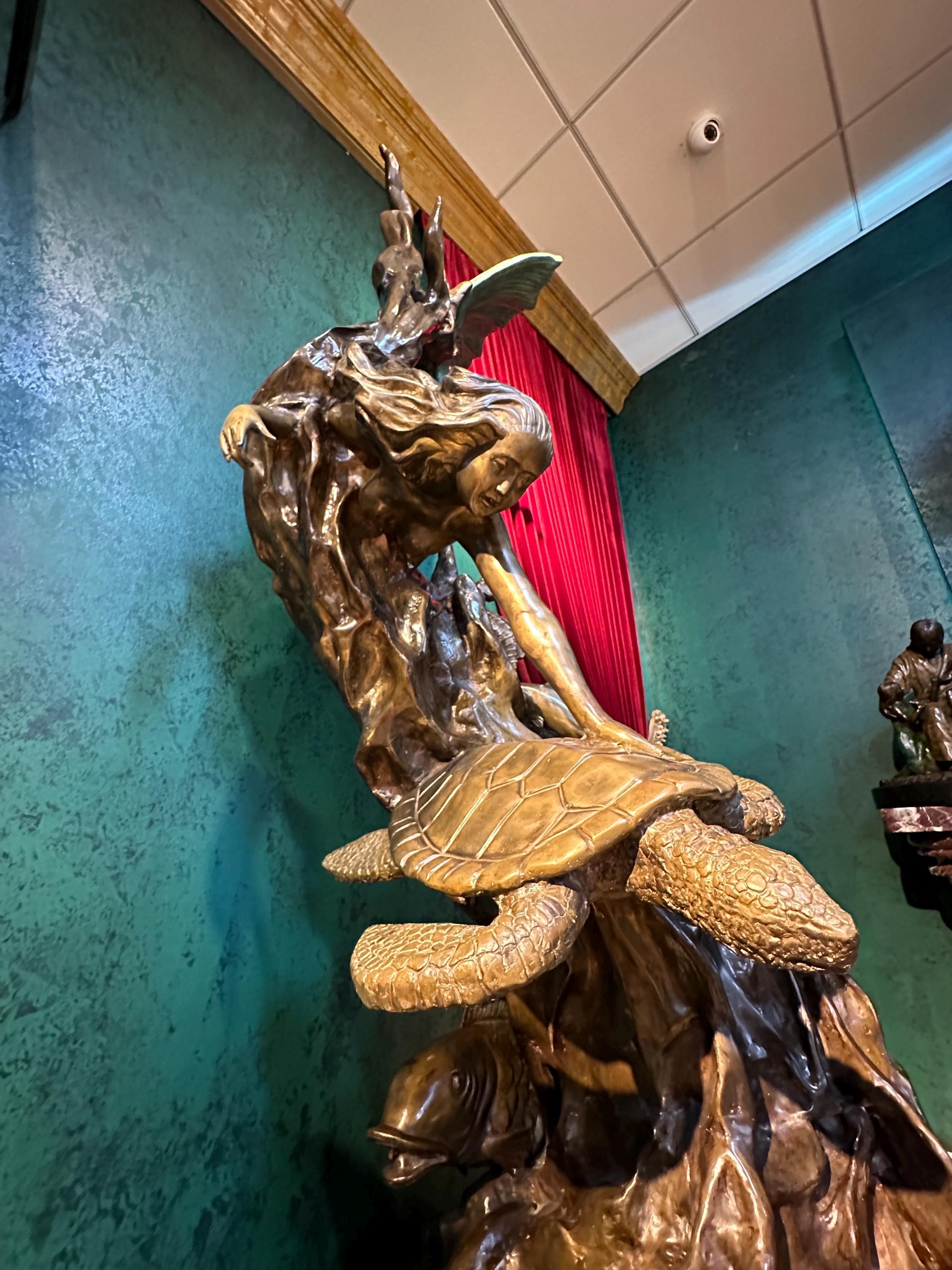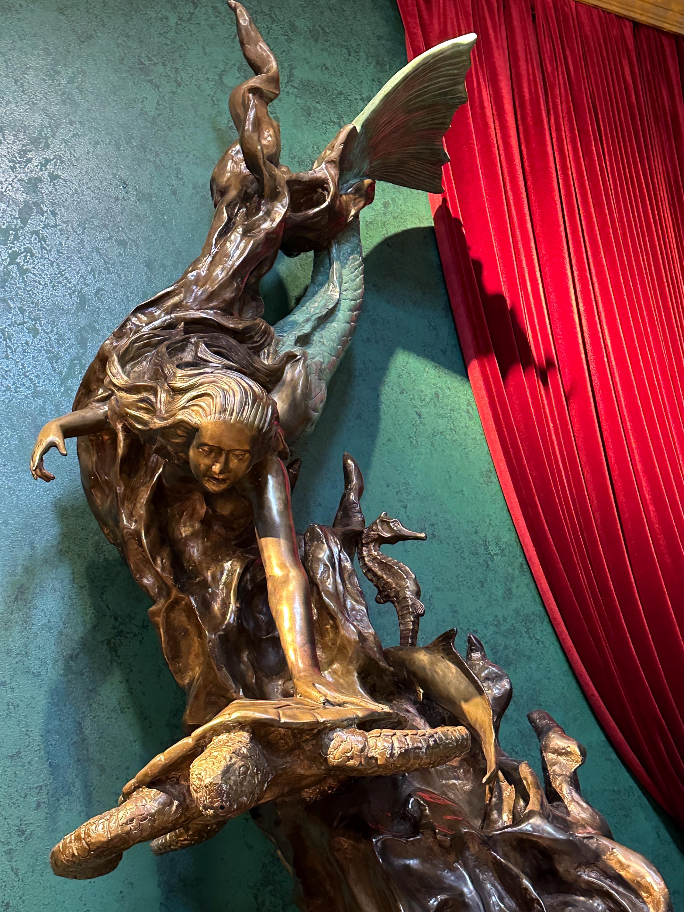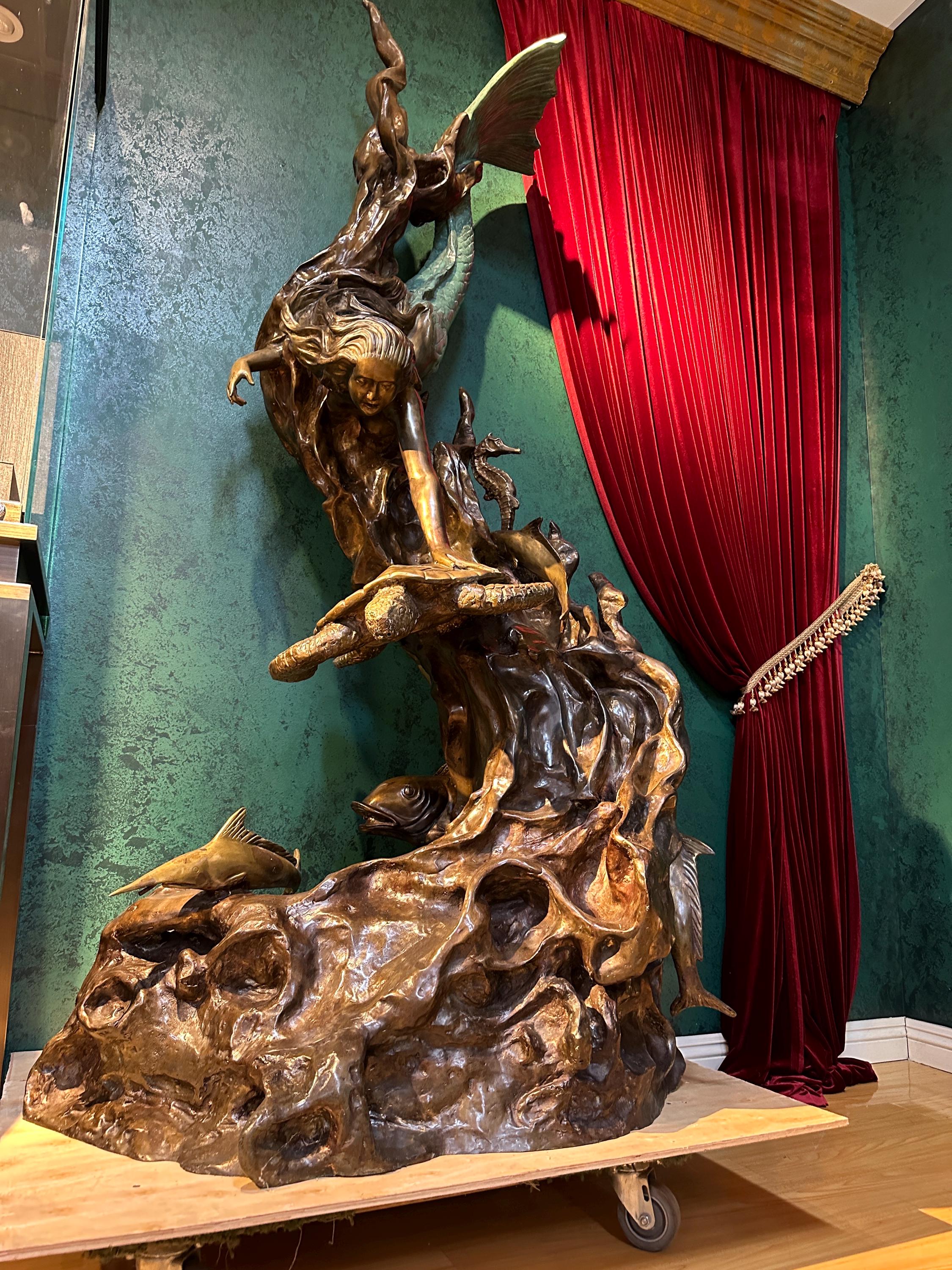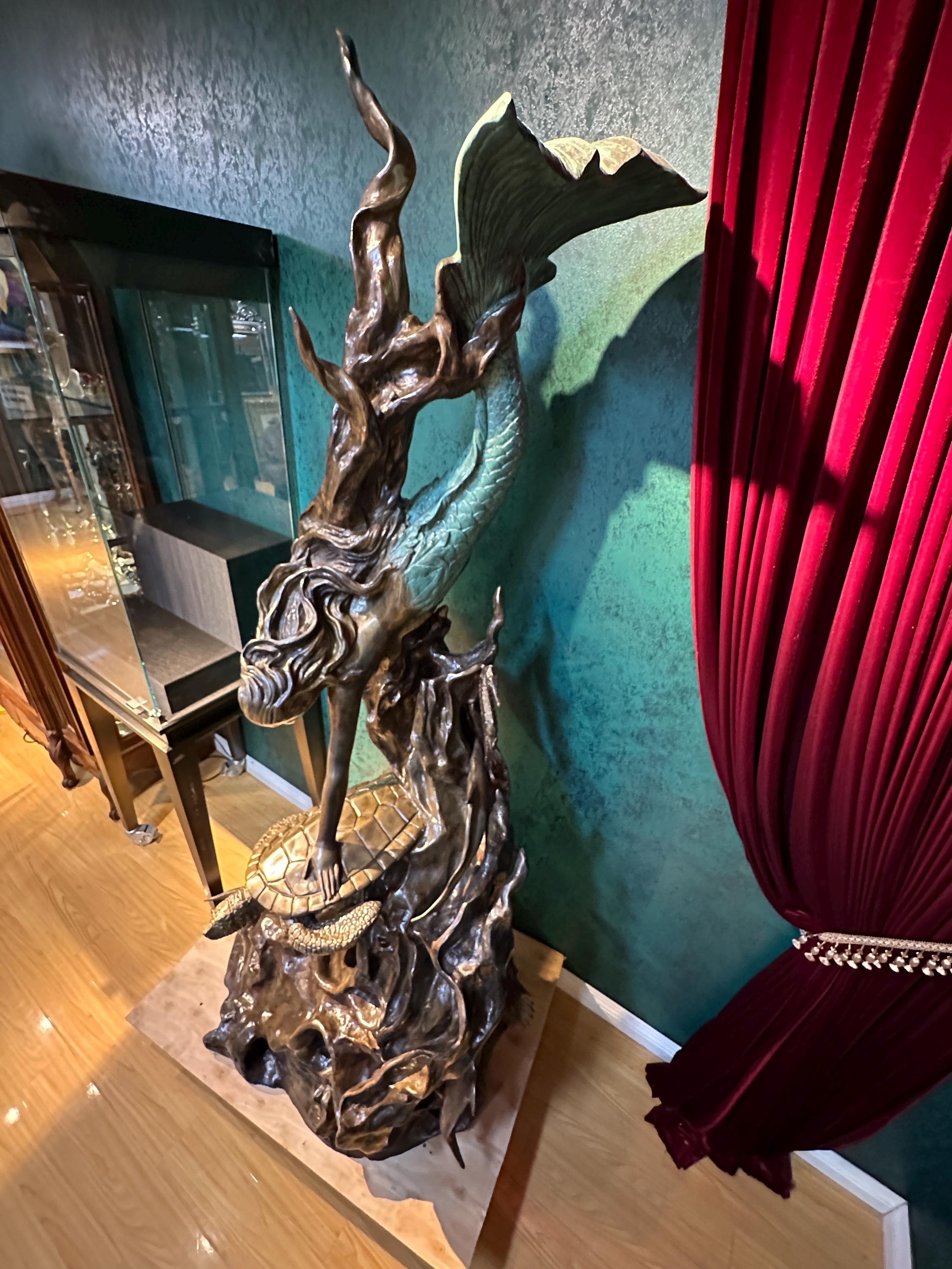 Listed is a magnificent 7 foot tall bronze fountain. Known as the capital underwater adventure, the goliath fountain features no less than four spouts From the mouths of the various sea creatures nestled within it. The elegant mermaid is cascading downward towards the sea turtle with sea horses and fish embedded around her. Her tail features a beautiful green patina which helps accent the entire piece. Truly magnificent. This piece can be displayed inside or used outdoors as a functioning fountain. Fiberglass ponds are available upon request.