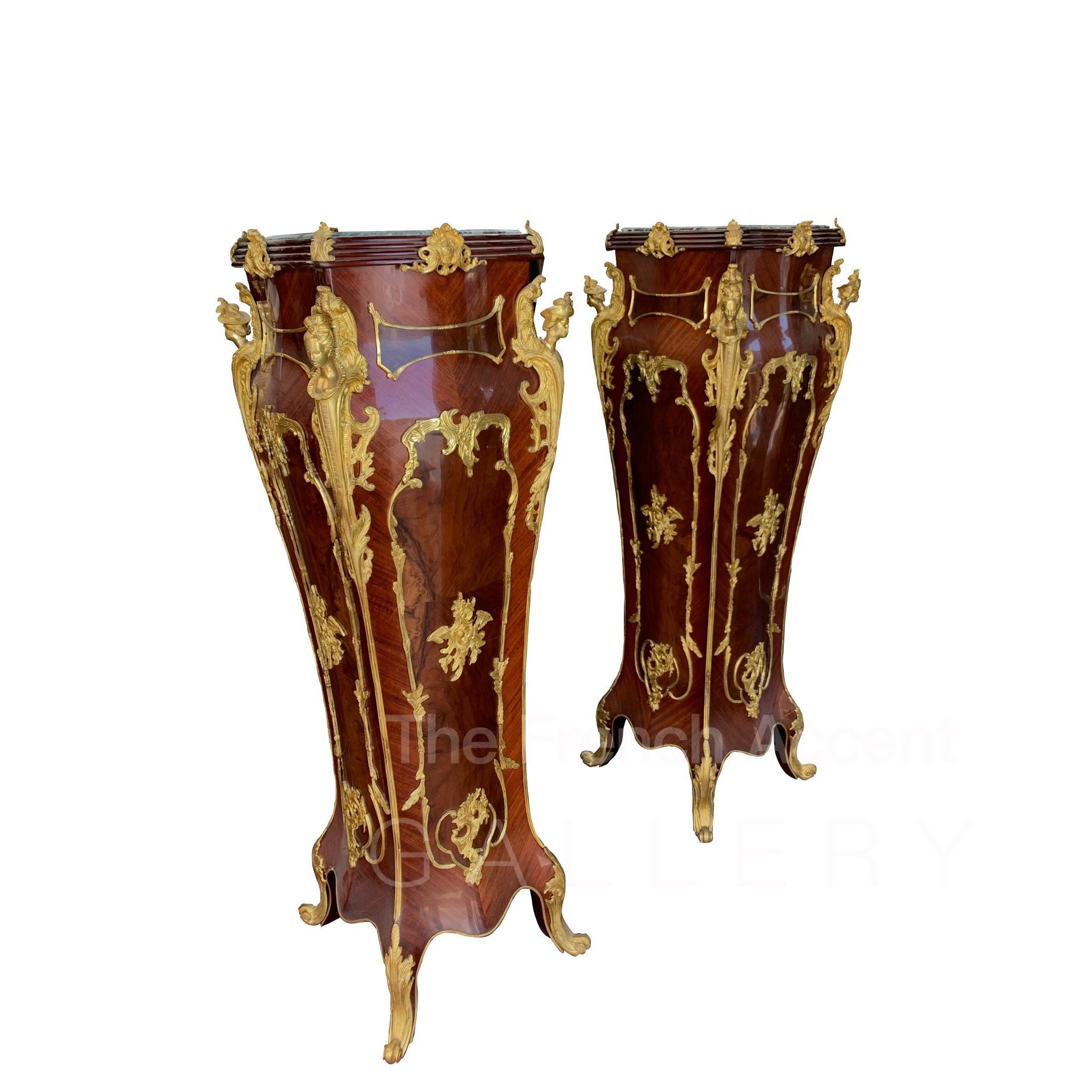 Our sublime Reproduction of The Royal French Louis XV style bombé shape gilt-ormolu-mounted veneer inlaid pedestal after the model attributed to Theodore Millet, the famed French cabinet maker and founder of the Maison Millet firm in Paris, c.1880, in the manner of Leon Message,