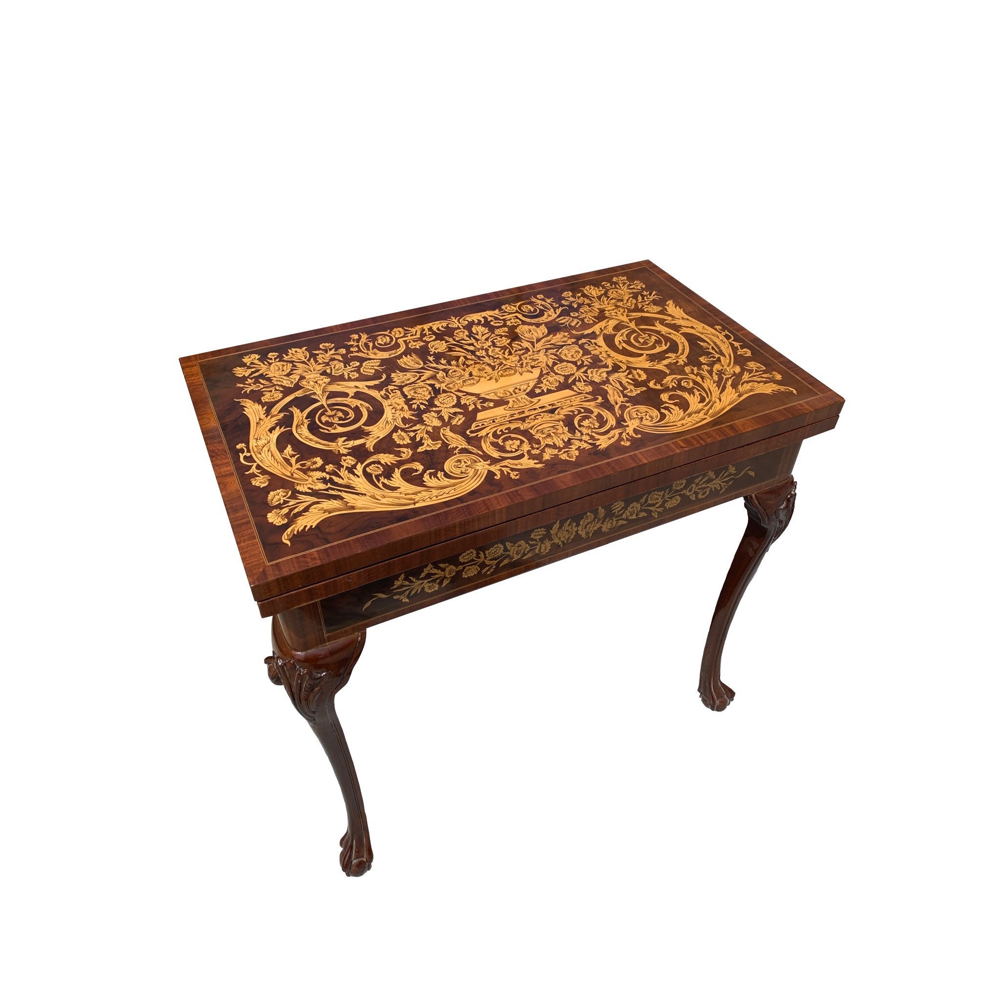 This is a classic Louis XV style game table with chess, checkers, and backgammon. It’s constructed from solid beech wood and features real fruitwood marquetry and inlay. The entire top pivots to store game pieces inside. A truly unique piece, when its not in use, it folds away and becomes a decorative table.