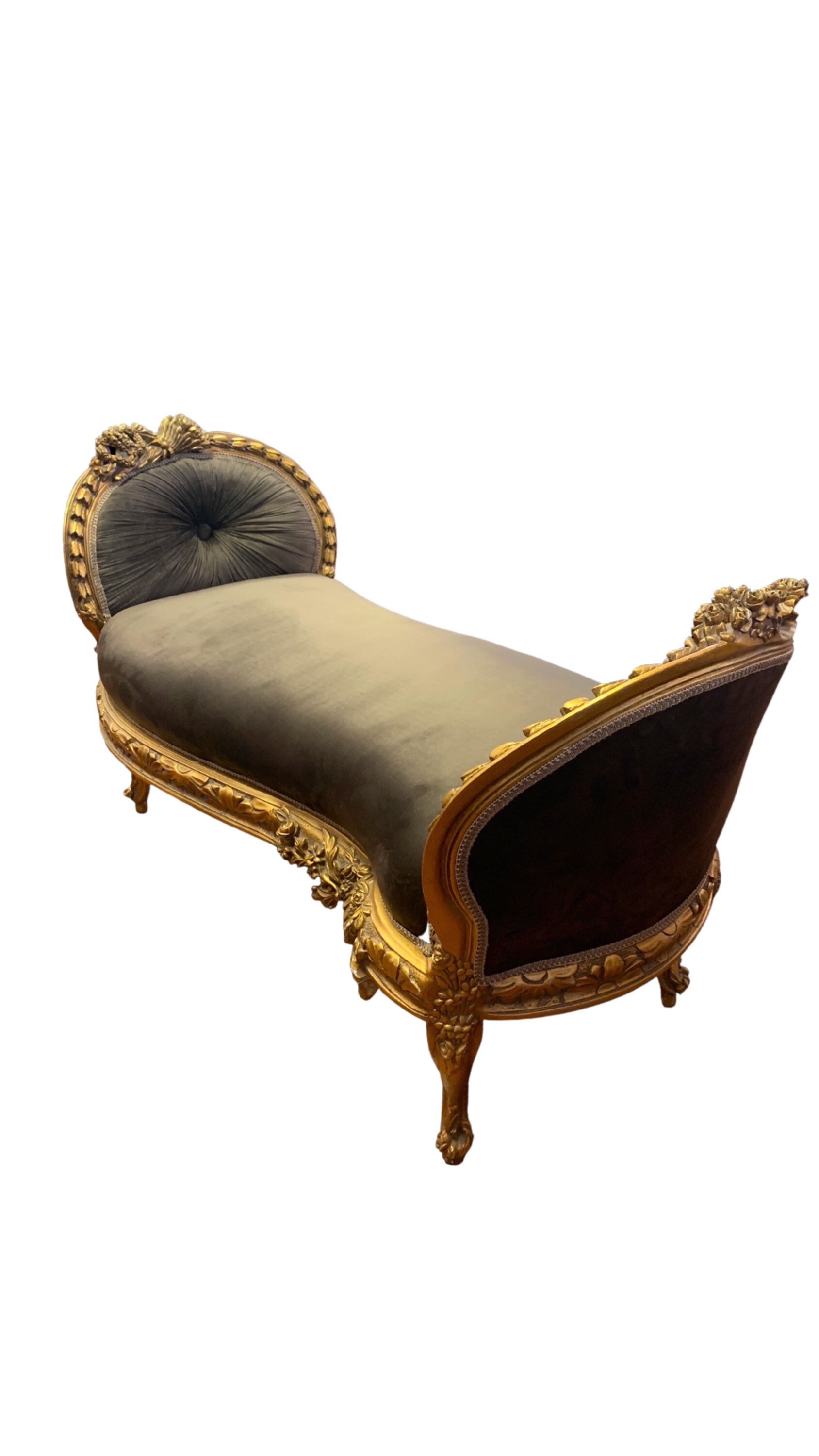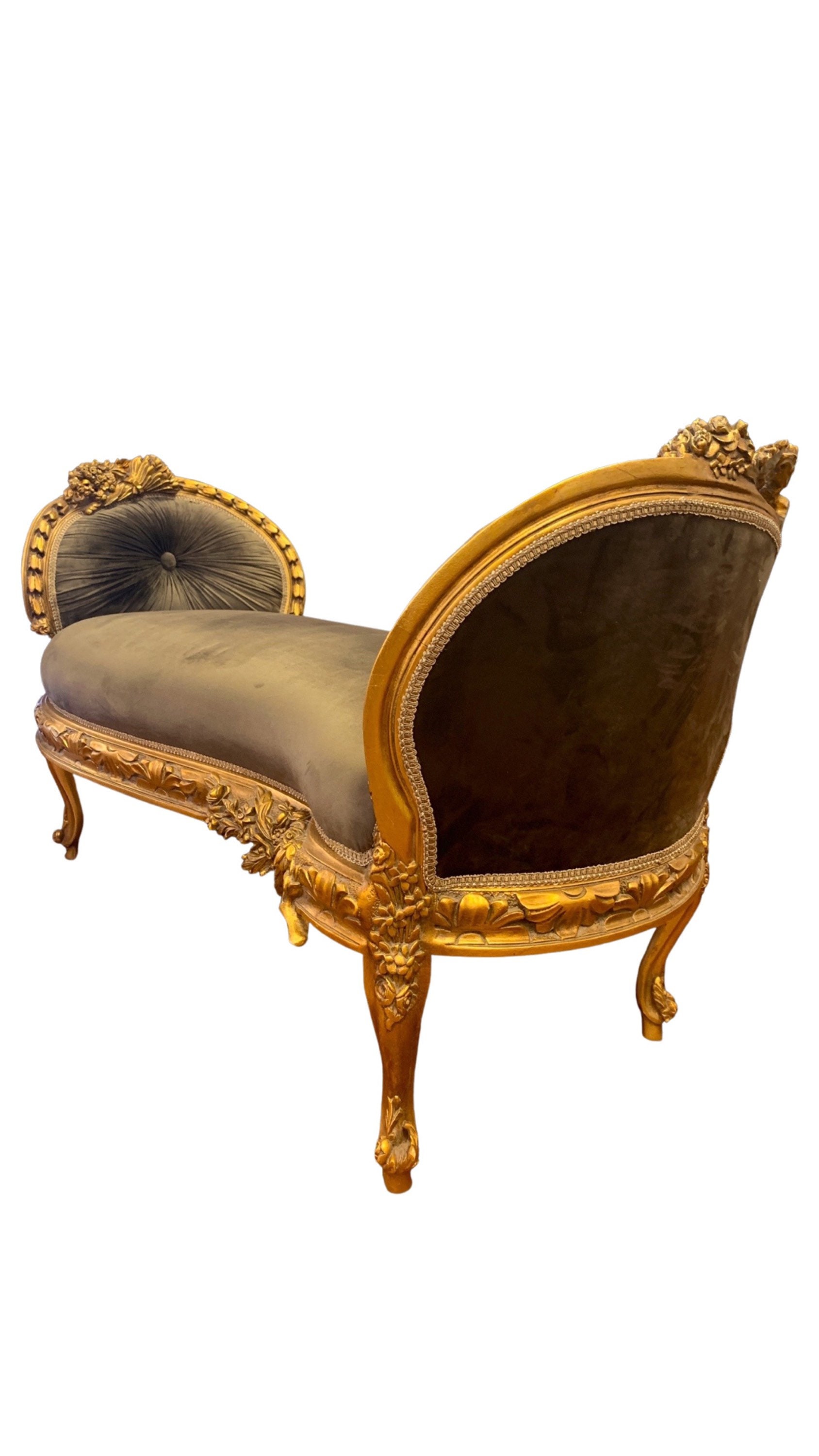 This classic French Louis XV style bench. It’s delicately hand carved from solid beechwood, finished in gold leaf, and upholstered in a rich brown velvet. New foam means this piece is ready for everyday use. Custom fabric options available