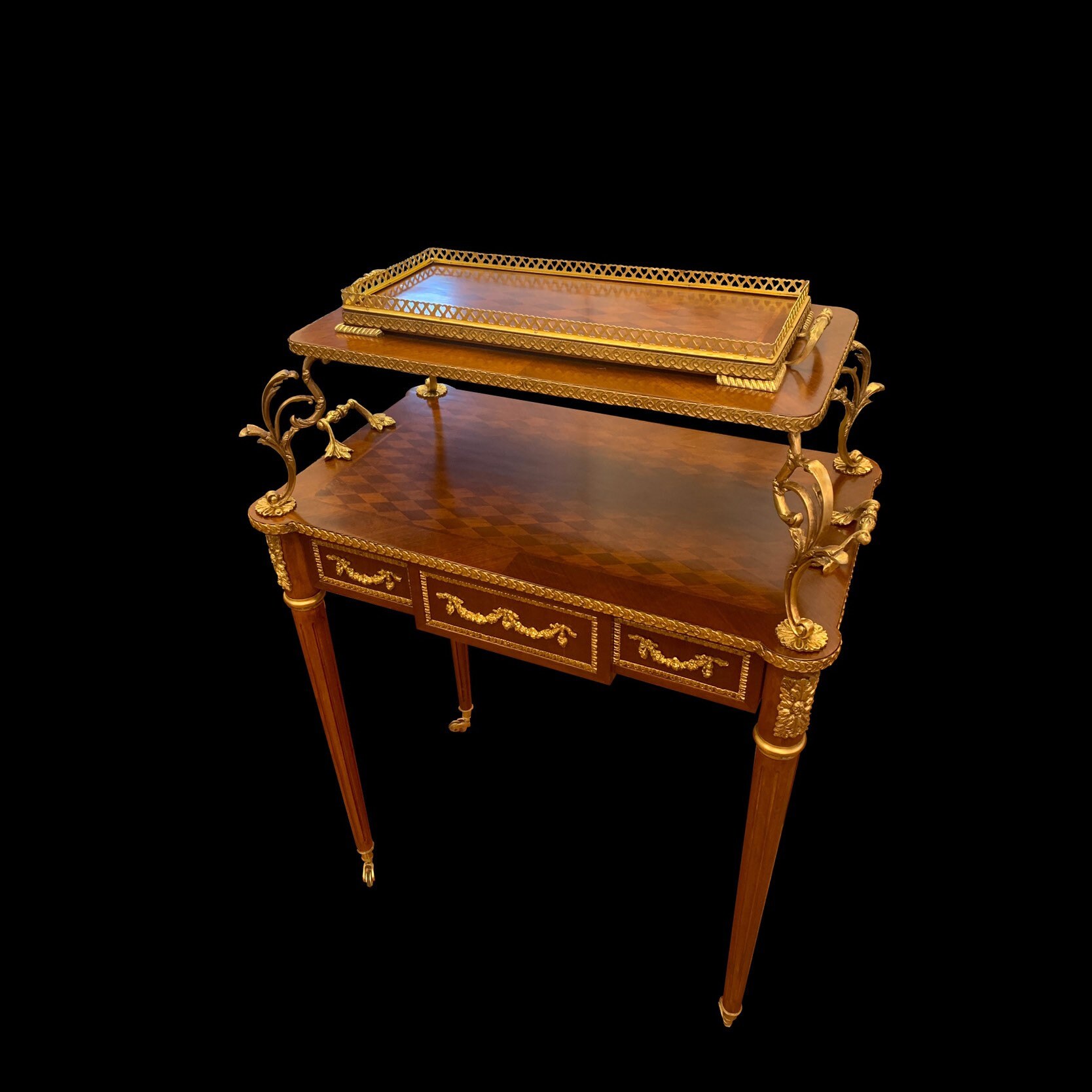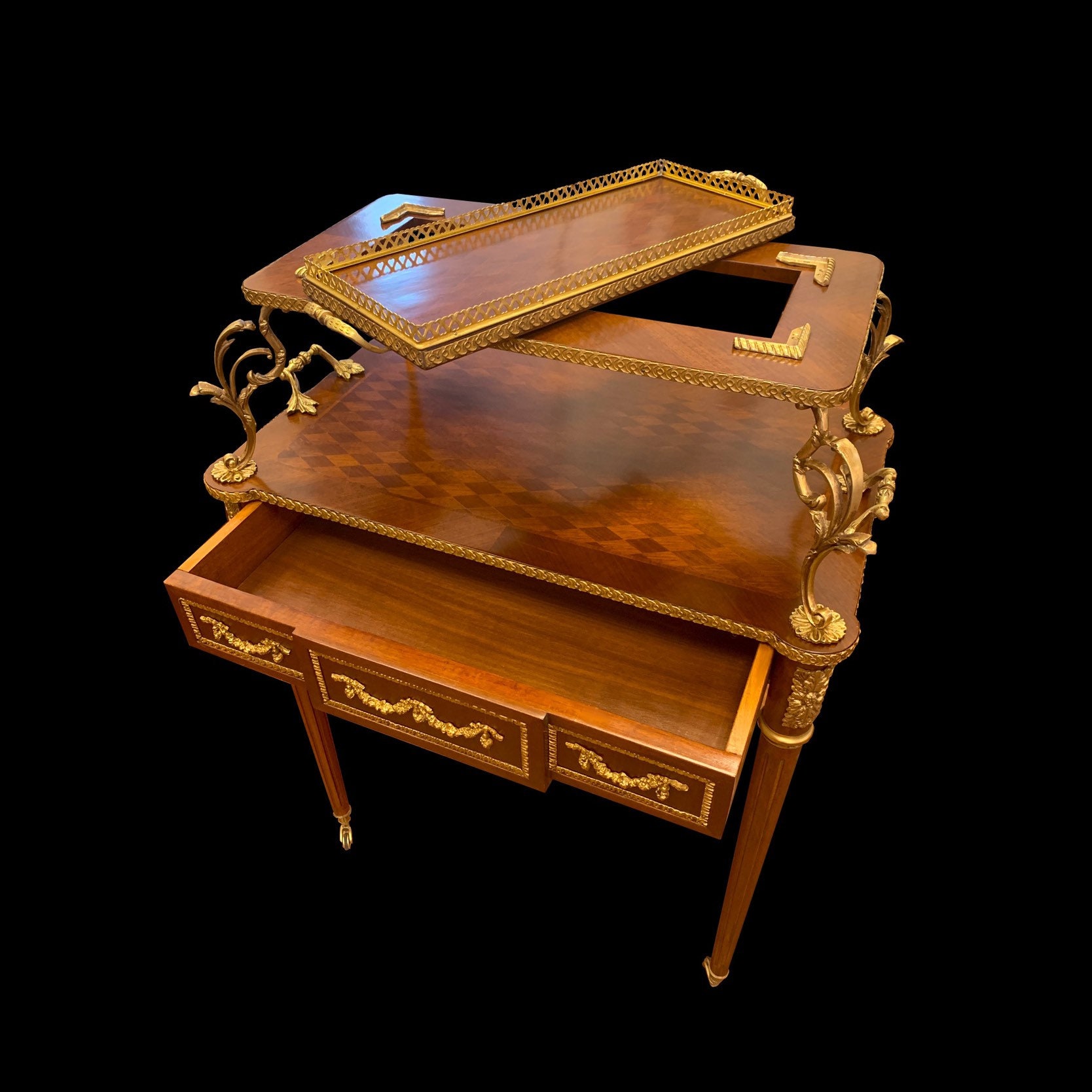 Listed a beautiful Louis XVI style serving table. It features real fruitwood inlay, rolling casters, brass ornaments and a removable serving tray. A period correct server for your formal salon or dining area.